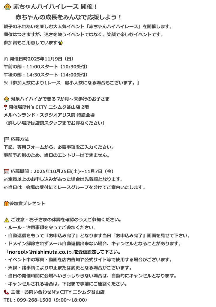 赤ちゃんハイハイレース応募フォーム 保護者氏名(漢字)※必須 保護者氏名(フリガナ)※必須 ご住所(郵便番号・都道府県・市区町村・番地)※必須 電話番号(連絡が取れる番号)※必須 メールアドレス(自動返信用)※必須 ※ドメイン解除をお願いいたします。 自動返信をもって『お申込み完了』となります。 当日『お申込み完了』画面を受付でご提示ください。 お子さま氏名(漢字)※必須 お子さま氏名(フリガナ)※必須 お子さまの生年月日(西暦入力)※必須 性別※必須 —以下から選択してください—男の子女の子 月齢※必須 —以下から選択してください—7か月8か月9か月10か月11か月12か月以上 現在の発達状況※必須 —以下から選択してください—ハイハイ中つかまり立ち可歩行し始め ※歩行している場合は参加対象外となります。 希望するレース時間帯※必須 午前の部(11:00スタート)午後の部(14:30スタート) 以下の内容に同意しますか?(すべて必須) 自動返信をもって『お申込み完了』となります。当日『お申込み完了』画面を見せて下さい。 ドメイン解除されずメール自動返信出来ない場合、キャンセルとなることを了承します。 当日のルール・注意事項を確認し、遵守します。 お子さまの体調が万全であることを確認します。 イベント中に撮影された写真・動画が広報等に使用されることを承諾します。 当日の開催時間に会場へ来場しない場合、自動キャンセルとなることを了承します。 イベント実施中での事故や怪我、病気等に関しては当施設は一切の責任を負いかねます。その旨ご了承の上お申込みいただきますようお願いします。 備考・お問い合わせ(任意) ※こちらの応募フォームで入力頂いた個人情報は、本イベント運営以外の目的で使用することはありません。 個人情報の取り扱いについては、ニシムタホームページ内「個人情報保護方針」をご確認ください。 上記内容を確認し、送信します。